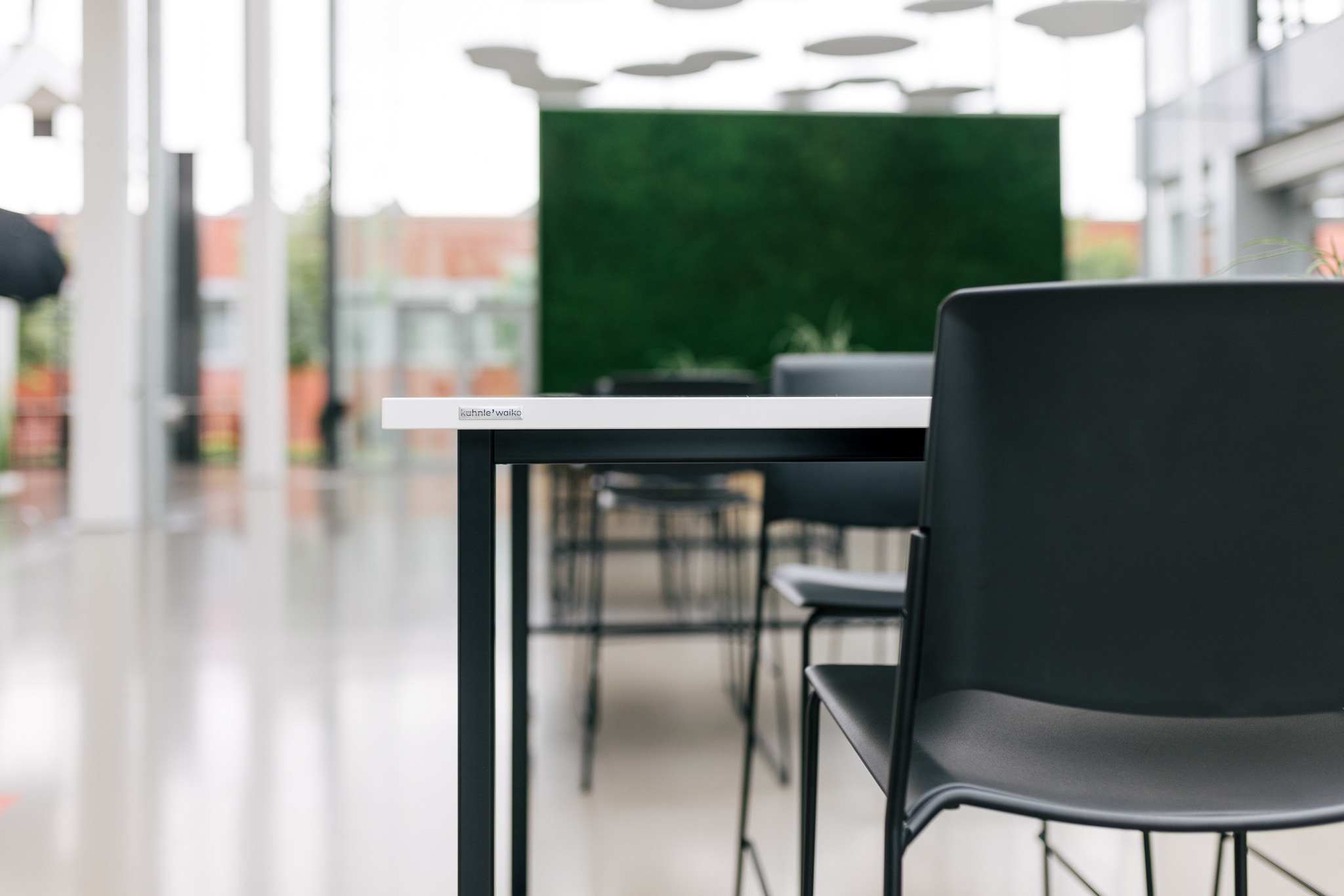 Durch die klassisch schwarz-weiße Farbausrichtung, eine grüne Mooswand, hohe Decken, gepaart mit Deckensegel als Akustikelemente, wird die zentrale Piazza zu einem Ort der Begegnung. Umrahmt von anderen Gebäudeeinheiten, bietet die lichtdurchflutete Piazza Orientierung und kann variabel umgestaltet werden. Für Veranstaltungen und Events lassen sich die Tische auf Rollen problemlos umplatzieren und flexibel nutzen.